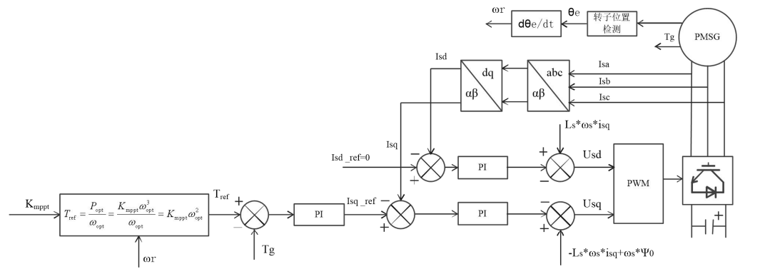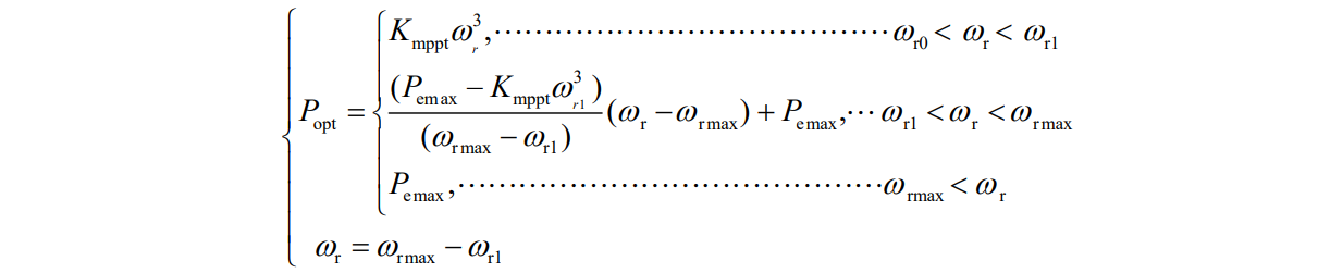 从上式可看出,发电机的电磁转矩与定子 q 轴电流成正比,因此通过调节iq 即可调节永磁同步发电机的电磁转矩,进而调节发电机和风力机的转速,使之跟随风速变化。最佳转矩法只需测量出发电机转速,控制发电机从轴上吸收的转矩与转速符合最佳转矩曲线的关系,但由于旋转部件惯性能量的存在,始终存在一定的转速差△ωr,因此需要根据计算发电机电磁功率最优值 Popt 从而推算最佳转矩,从而产生发电机最佳转矩,通过对发电机转矩的有效控制实现最大风能捕获。Popt 公式与转速差△ωr 分别表示如下: