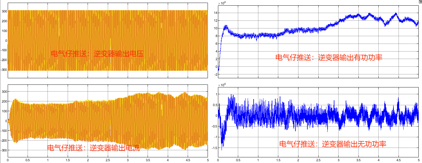 上图为并网逆变器的相关输出波形,可见,逆变器的有功输出与风机的功率输出保持一致,电流波形随风速波动而变化。