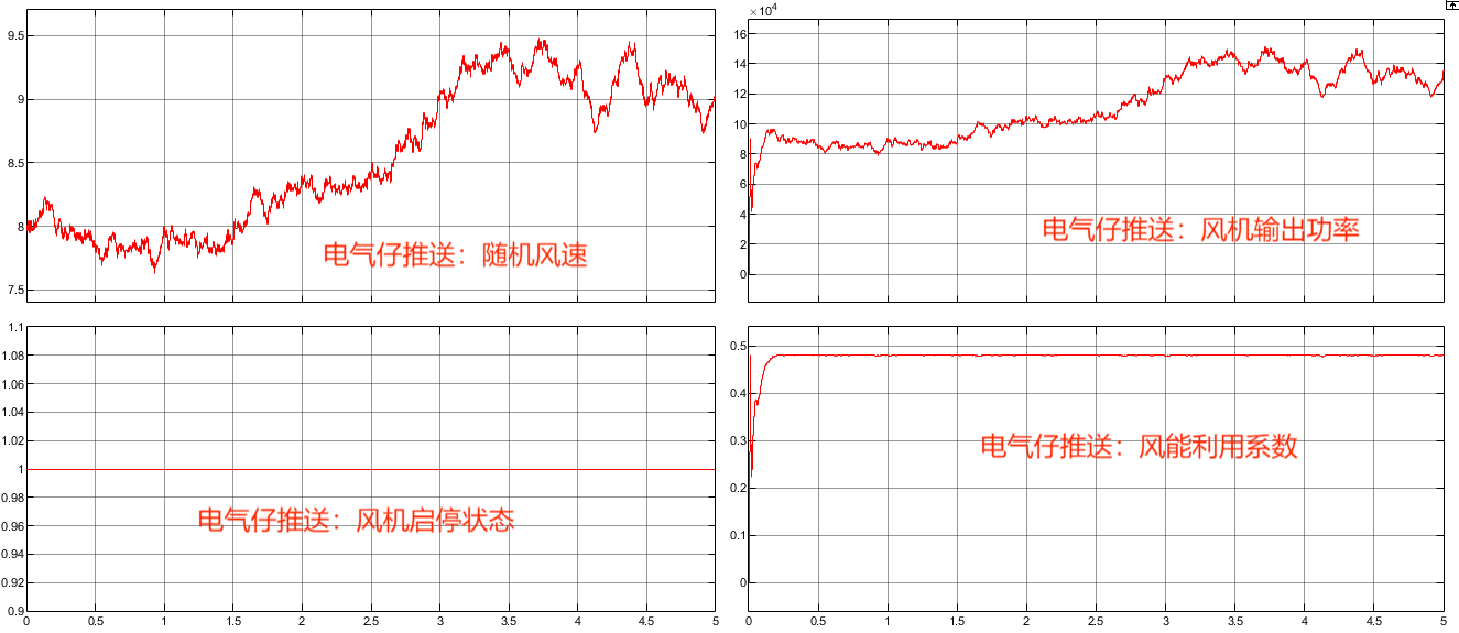 上图为永磁同步风机的相关输出波形,在风速为8m/s时,风机的输出功率大约为80kW,风能利用系数一致保持在0.48。