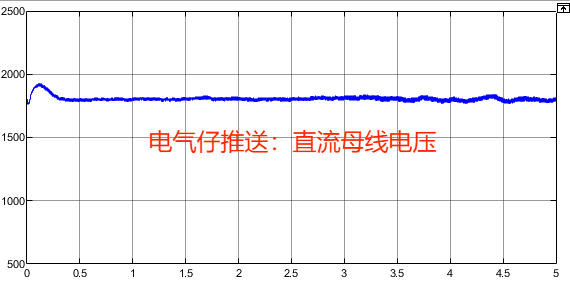 上图为直流母线电压的输出波形,随着风机风速变化,直流母线电压也会随之波动,因为背靠背式变流器的调节作用,电压仍能维持在1800V。