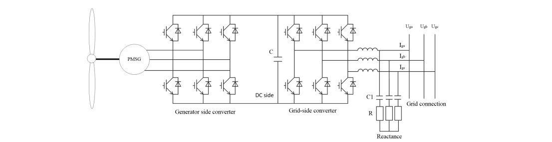 永磁直驱风电机组带储能系统的基本结构如图所示。系统主电路采用背靠背式全功率变流器,发电机首先将风能转换为频率和幅值变化的交流电,经过机侧变流器整流之后变为直流, 然后通过控制网侧变流器输出电流的频率和相位来跟踪并网电压的频率与相位,从而将交流电传递到并网。其中,iga、igb、igc 分别为三相并网输入电流,Uga、Ugb、Ugc分别为三相并网电压。