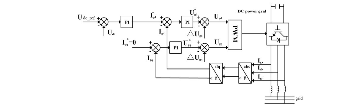 通过外环 Udc_ref 与 Pdc_ref 分别与 Udc、Pdc 产生偏差经 PI 控制得到d、q 控制电流Igd*、Igq*, 再经电流内环 PI 控制得到得到相应的控制电压Ugd*、Ugq*,并加上交叉耦合电压补偿项 ΔUgd 和 ΔUgq , 便可得到最终的 d、q 轴控制电压分量Ugd 和Ugq,然后通过PWM 控制技术可得到电网侧变流器所需的驱动信号,实现功率的传输。
