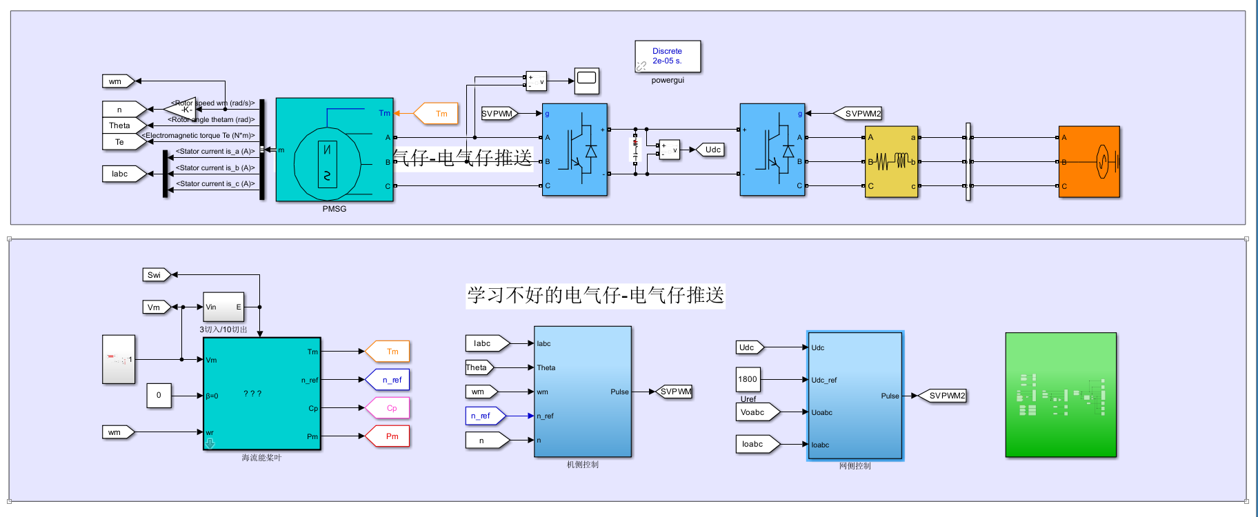 此模型是经典的永磁同步风机并网模型,采用背靠背式变流器,中间直流母线1800V;采用随机风速模型模拟风速,更有利于波形分析。模型各部分完整,适合课程设计参考,赠送建模说明文件(与模型保持一致)。