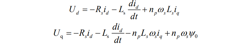 永磁同步发电机具有功率密度大、体积小、转矩/惯量比大、动态响应快等一系列优点。它属于强耦合的非线性系统,其数学模型是设计电机、分析电机性能及控制电机的基础,同时也为改善控制系统的性能提供了理论依据,在转子磁场定向方式下,永磁同步电机在dq同步旋转轴下的数学模型可表示为: