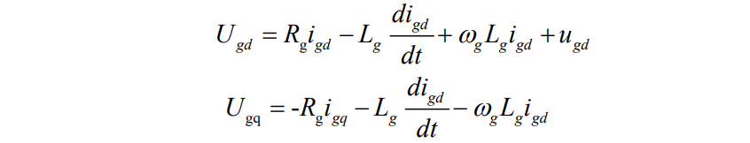 选取两相同步旋转 dq 坐标系中的 d 轴作为电网侧电压空间矢量方向,q 轴超前d轴90度,网侧变换器的数学模型为: