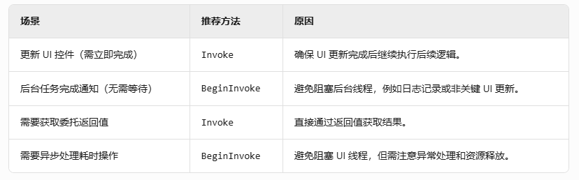 BeginInvoke的线程不会阻塞,委托会立即被加入目标线程的消息队列,由目标线程异步执行。 - 适用场景:不关心被调用代码的执行结果,或希望避免阻塞当前线程。