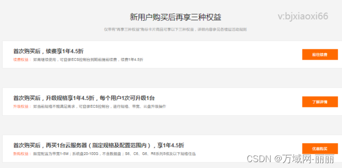 促销活动也是大家选择阿里云的重要因素之一。官网可以领到的代金券,新人特惠,享受三重权益,及其他单品活动以及针对老用户的各种优惠等等。