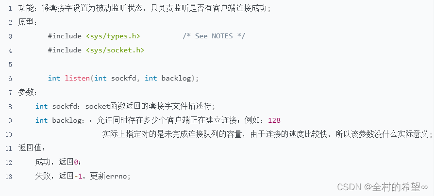//将套接字设置为被动监听状态,监听是否有客户端连接成功