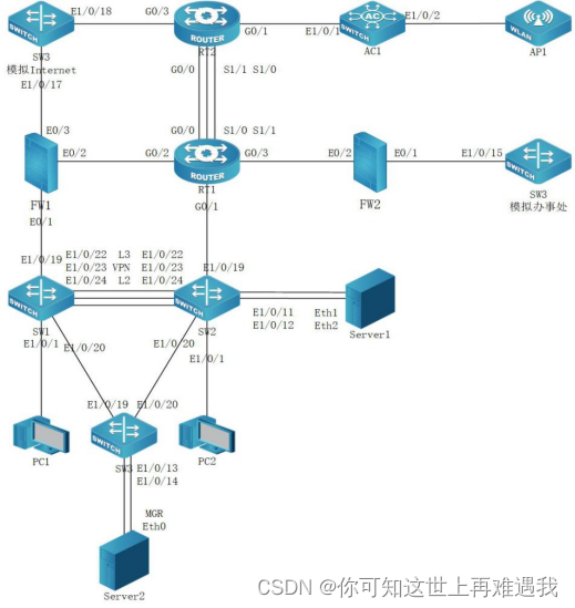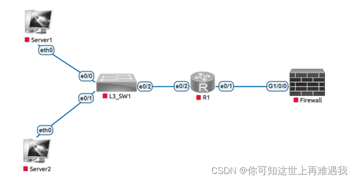 某单位网络拓扑架构如下,交换机连接两台服务器,其中Server1服务器是数字取证服务器,Server2服务器是应急响应服务器,通过交换设备相连,通过路由设备连接到安全设备防火墙,单位的网络拓扑结构如下图所示。