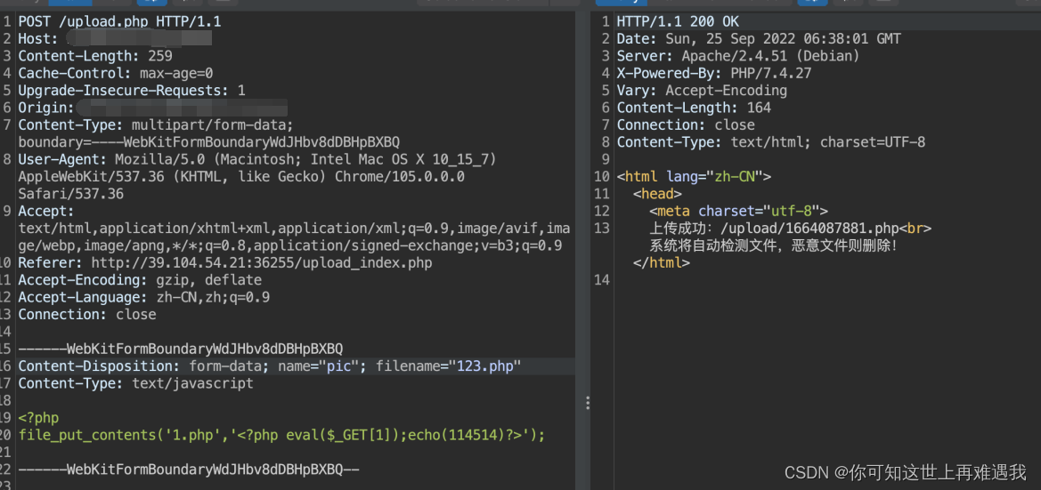 上传后会提示自动检测文件,猜测是条件竞争,在系统还没检测删除前访问php执行代码写入一句话