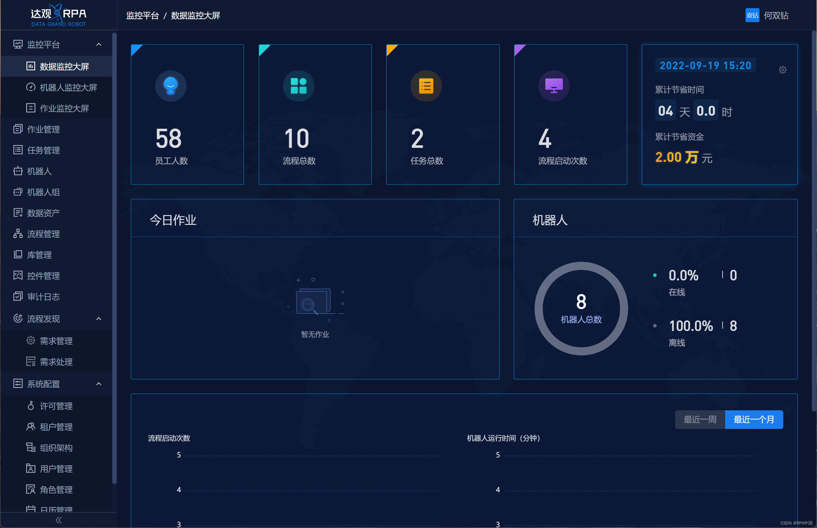 报表分析:控制中心提供了关于机器人所有的数据,我们可以通过这些数据来进行各种统计分析。比如,分析某个流程的执行成功率、某个机器人的执行效率等。