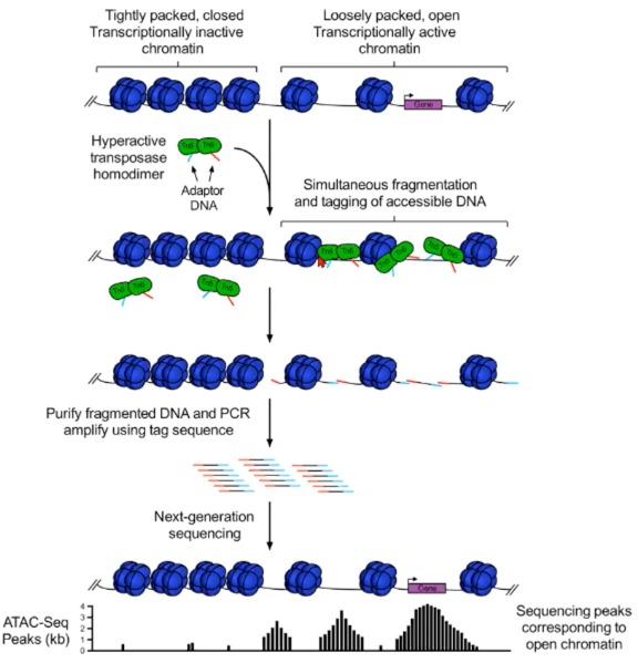 同时的DNA断裂和标记:在松散打包的、转录活跃的染色质中,超活跃的转座酶将适配器DNA插入到开放的染色质区域。
