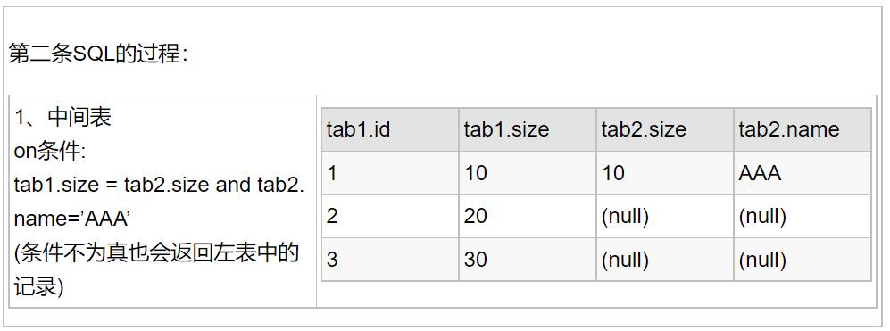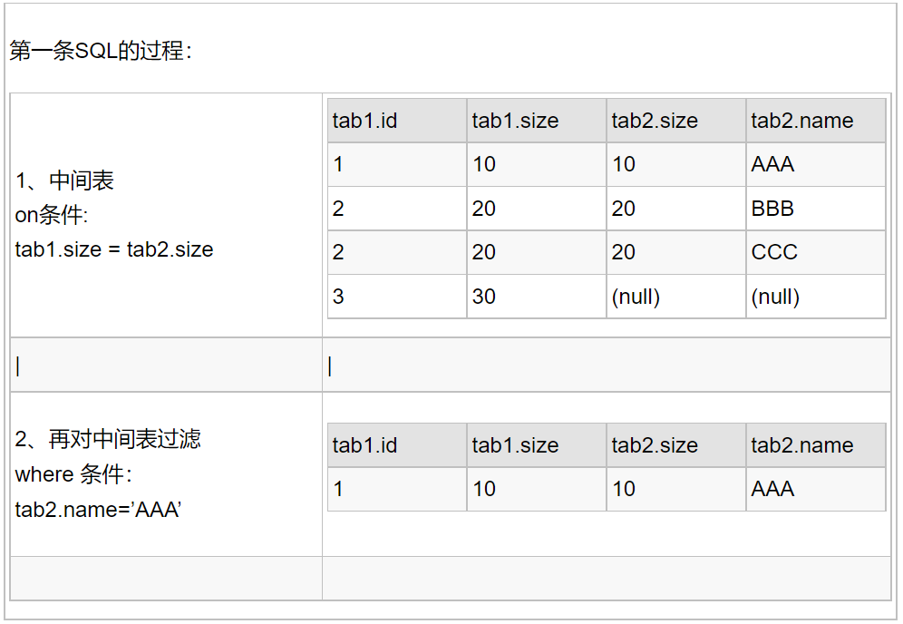 1、select * form tab1 left join tab2 on (tab1.size = tab2.size) where tab2.name=’AAA’ 2、select * form tab1 left join tab2 on (tab1.size = tab2.size and tab2.name=’AAA’)