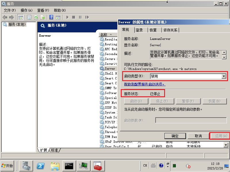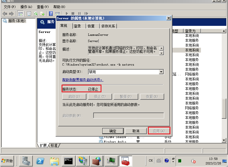 (2)漏洞加固过程 打开服务->找到Server->关闭Server服务,以防止攻击者利用此漏洞以夺取服务器权限。