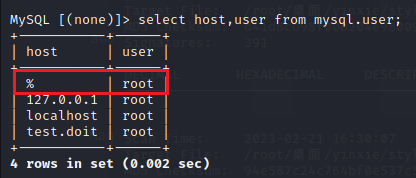 (1)漏洞发现过程或思路 使用nmap扫描,发现3306端口为开放状态,猜测mysql管理员账号可能存在弱密码,尝试使用hydra破解堡垒机mysql管理员密码aababb,爆破成功。数据库存在root用户弱口令漏洞