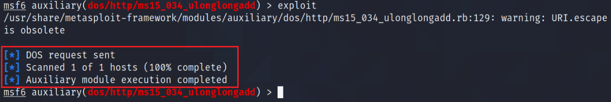 (3)漏洞加固验证过程 再次使用msf载入MS15-034的auxiliary/dos/http/ms15_034_ulonglongadd攻击模块对堡垒机进行漏洞利用,堡垒机未蓝屏,漏洞已无法被利用,加固成功。