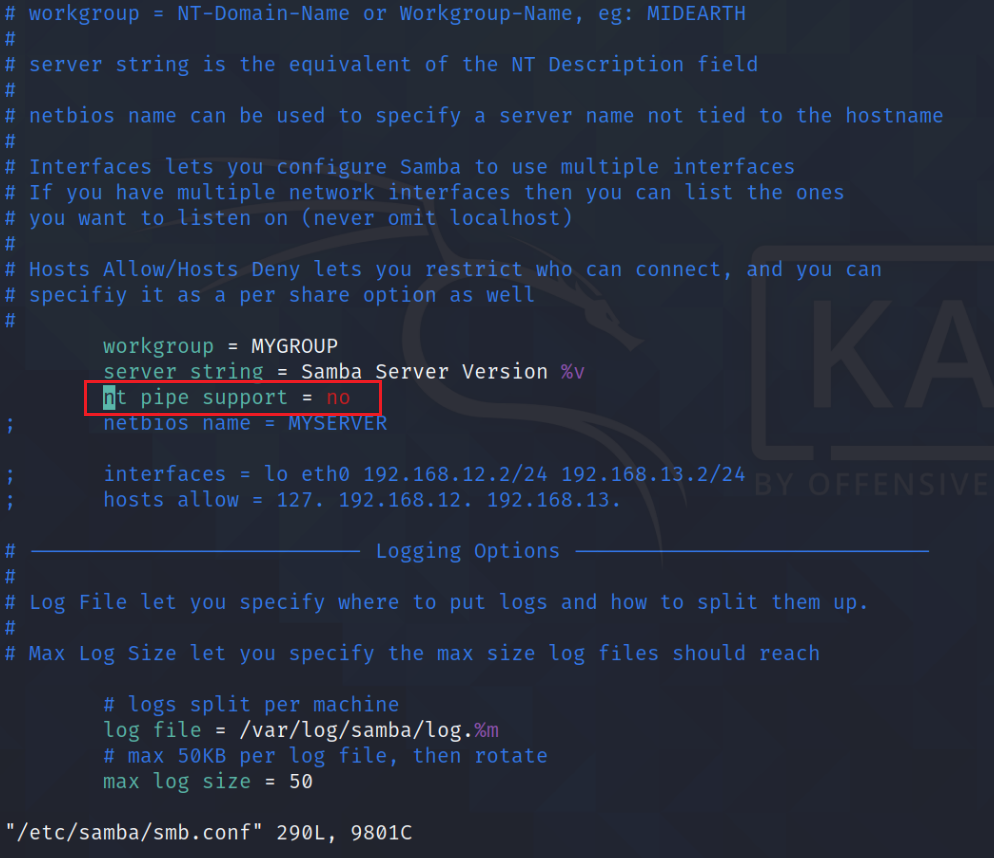 (2)漏洞加固过程 修改/etc/samba/smb.conf配置文件,在global节点内新增配置项nt pipe support=no,以缓解漏洞带来的影响。