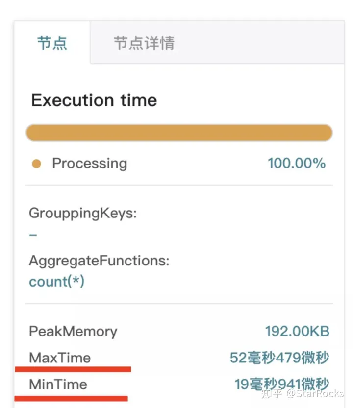 在 profile 图中,点击任意一个节点,可以看到如下图所示的信息。「节点」中的 MaxTime、MinTime,分别表示此节点的多个不同“执行实例”的最大、最小执行时间。同时 MaxTime 和 MinTime 差异过大时,一般说明有数据倾斜,或者有慢节点。