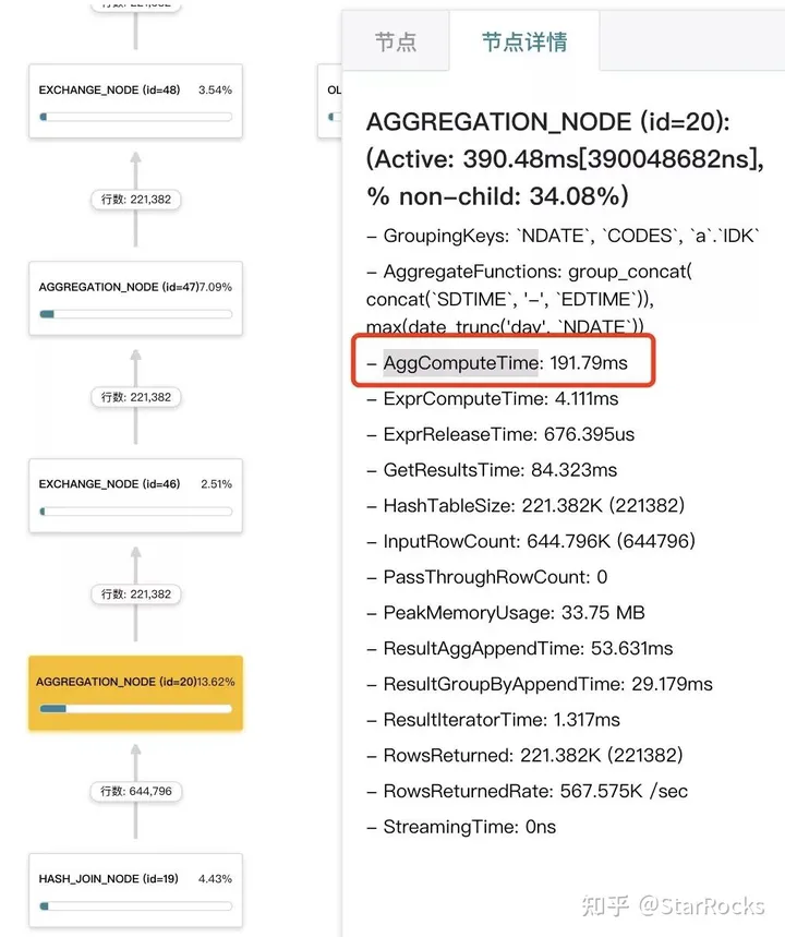 我们发现,CASE-A 中的「B 逻辑」很耗资源,占约 30%的执行时间,其中 group by + group_concat 的逻辑约占 20%。还可以在「节点详情」中看到 AggComputeTime 的时间,占了整个 AGGREGATE 节点一半的执行时间。