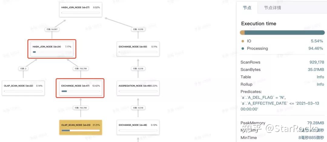 - 同时,可以看到左节点 OLAP_SCAN_NODE 返回的行数也变少了很多(见上下图中黄底的节点)。这个功能叫「Join 的右表往左表谓词下推」:右表过滤结果很小时,StarRocks可能会将右表谓词往左表下推,从而直接减少了左表的返回数据量(可以通过设置 hash_join_push_down_right_table 开关变量来验证效果)。最终也节省了约13%。