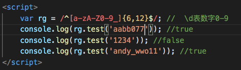 分析:如果不写{6,12} 则下面的打印结果都为false 因为方括号里只允许匹配一个 但是像密码用户名之类 需要多位字符 就可以在后面写上{ 6,12} 这代表前面的[\d\w_] 可以出现的次数