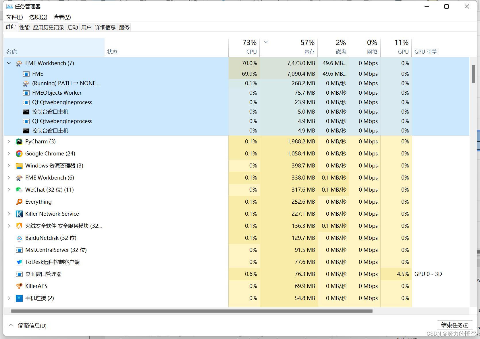 大家在购买CPU时,都会遇到一个核心参数,CPU核心数和线程数。在学习python,java等编程语言时,也会涉及到多线程、多进程编程。很多小白会认为二者是一致的,一个进程占用一个核心,一个线程占用一个线程。但是其实二者的本质是完全不相等的,一个进程的运行,CPU会根据进程的计算量大小和占用资源合理的分配核心数和线程数。意思就是我们一个FME模板在理论上是可以拿到很高的CPU占用的。