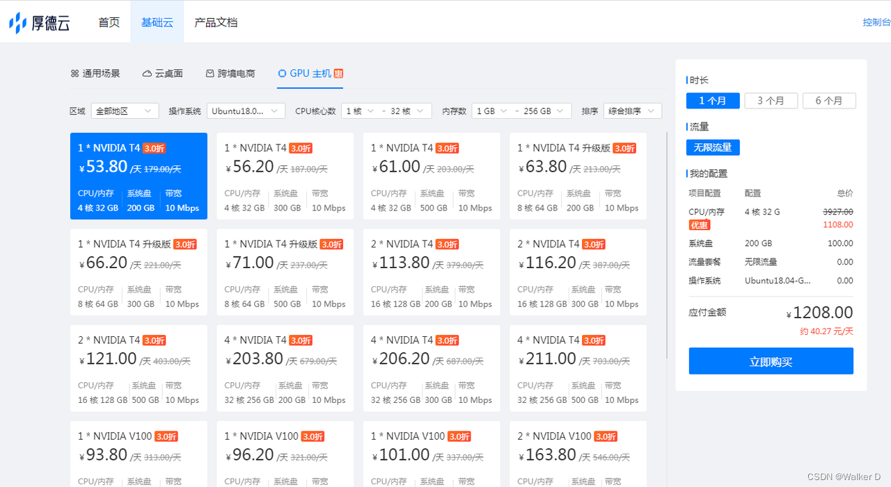 云主机的配置要够高,这里我真心推荐厚德云的云主机,新人注册有代金券可以用,可以按天按月购买,有各种配置可以选,价格也还好。我是直接先买了一天的,搭建试试。