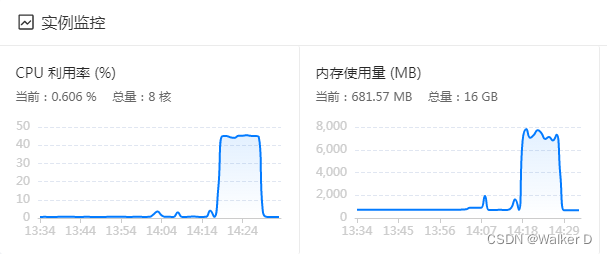 看了下云主机监控,生成的这段时间飙了这么高,CPU 大概占了 45%,内存也差不多。