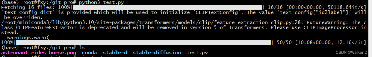 不出意外的话,开始需要下载很多东西,好多好多 G。下载之后会开始生成图片,一些 Warning 可以直接忽略。
