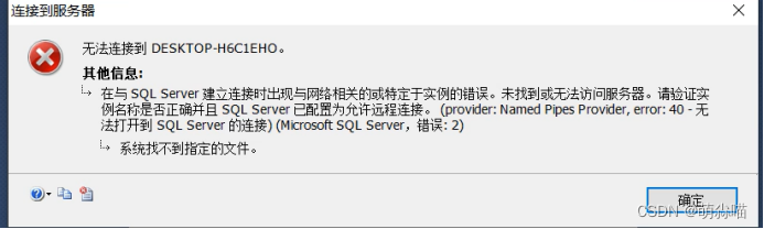 首先,我们在登录SQL Server时会遇到登不上去的情况,然后出现无法连接DESKTOP-H6C1EHO,error:无法打开到SQL Server的连接。如下图: