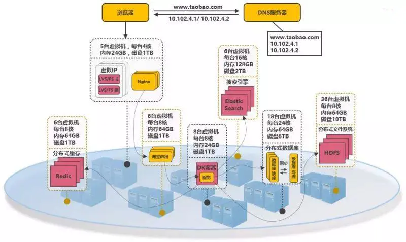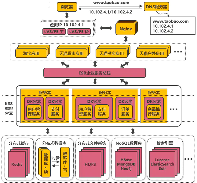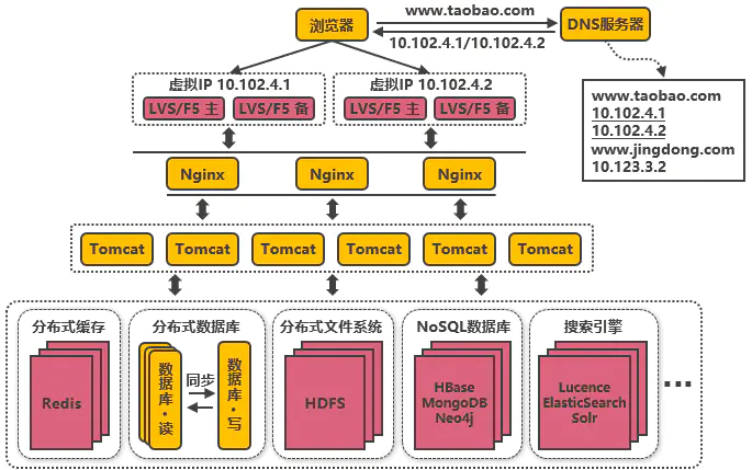 浏览器往www.taobao.com发起请求时,首先经过DNS服务器(域名系统)把域名转换为实际IP地址10.102.4.1,浏览器转而访问该IP对应的Tomcat。