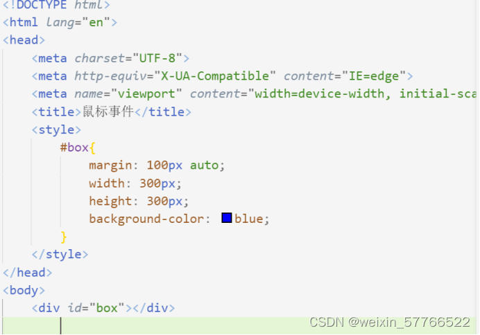 鼠标事件 2.在div下面写script通过var 声明一个变量box= document.getElementById(“box”)获取到他以后,box.鼠标移入onmouseover= function鼠标事件后面在跟着他要执行的代码(){接着改变他的背景颜色box.Style.BackgroundColor = “red”}鼠标移出box.onmouseout = function(){box.style.backgroundColor = "blue";} 3.先确定对象box.onclick = fun
