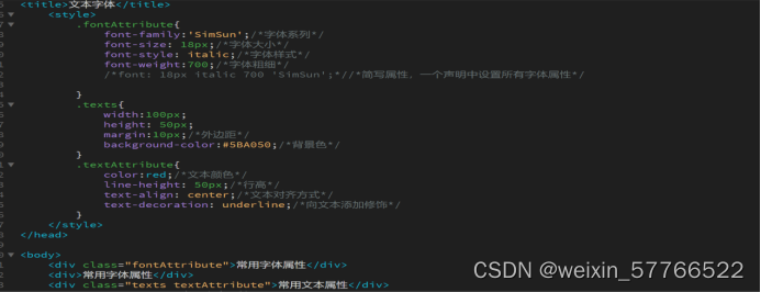 css 常用属性 1、字体和文本CSS字体属性定义字体,加粗,大小,文字样式.所有CSS字体属性 Property 描述 font 在一个声明中设置所有的字体属性 font-family 指定文本的字体系列 font-size 指定文本的字体大小 font-style 指定文本的字体样式 font-v