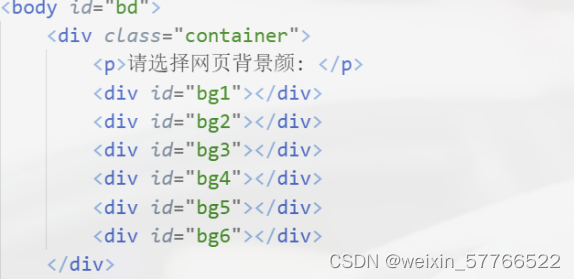网页换肤案例说明 1.首先在body里面给他一个ID名,先写div给他一个类名,然后在div标签里面写一个p标签里面写上,请选择网页背景颜色:, 在给6个div,div给他一个ID名 2.在style给他一个通配符把他的外边距设置为0像素,padding也设置为0像素,container的类设置他的宽为400像素,高为40像素同时文字是处于一个居中的状态,加一个line-height的行高也为40像素,边框border,1像素 实线 颜色为黑色,给他一个外边距 上下为50像素 左右为auto,padding填充上下为0,左右