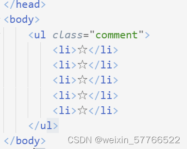 评分案例 2.在title标签下面给他一个style标签,在style标签里面给他一个*标签设置他的padding为0,margin为0,在*标签下面给他一个comment标签在标签里面给他一个font-size为40px,在给他一个color为yellow,然后在comment li里面给他一个float:left, 下面给他一个ul标签里面给他一个list-style为none。文本为实心的五 角星然后它前面的也要为实心的,在设置后面的为空心的。的星星变成实心的,然后设置它前面的。标签也为实心的,后面的所有的。.