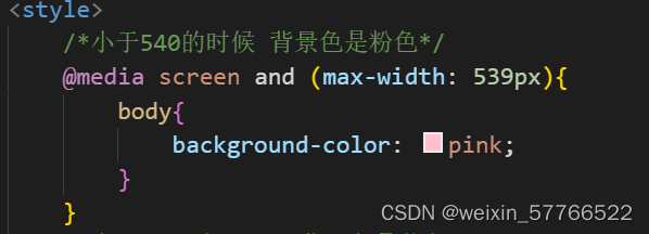 Media案例说明 首先小于539的时候为粉色,第一步通过@media做开头,后面是媒体是显示在什么上面,跟上screen 后面跟上and跟上之后加上小括号,max是最大宽度为539,然后设置一个颜色2.然后在第二个大于540,小于970的时候,同样以什么开头以@media 跟上screen and之后小括号min-width最小值为540像素,大于等于540,为蓝色3.第三个大于等于970是min-width: 970为一个红色这是...