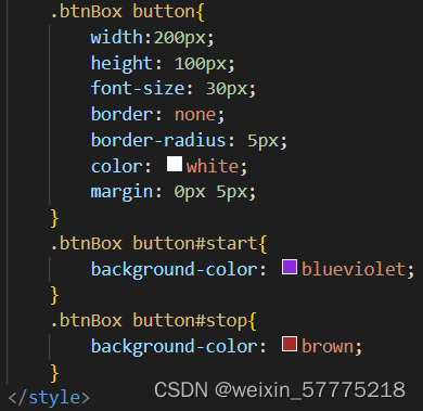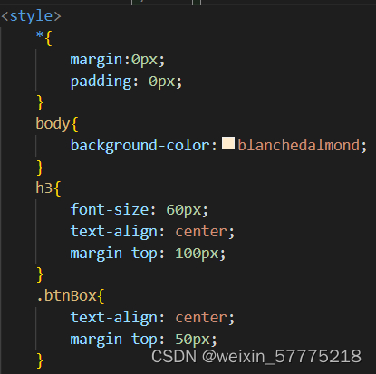 2.设置样式;创建一个style标签在里面给我刚才的创建的div设置上样式,用“*”通配符去掉浏览器自带的样式,设置上背景颜色、设置字体样式、按钮样式、因为两个按钮颜色不一样还要给按钮单独设置背景颜色(用“#”符号来获取id名进行设置)如下图: