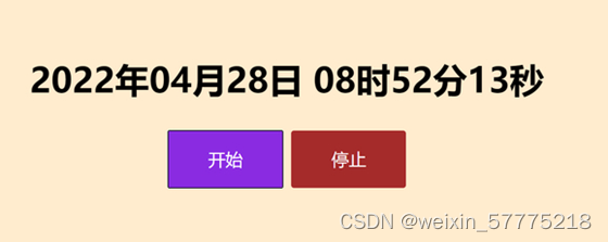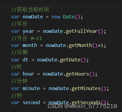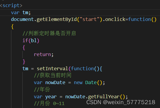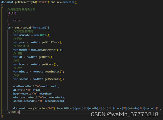 4.声明变量获取当前时间;在开始按钮点击事件下面声明好变量分别获取到当前的时间、年份、月份(注:getMonth()只能获取到0~11月我们要在其后面+1才能有12个月)、日期、小时、分钟、秒数,如下图: