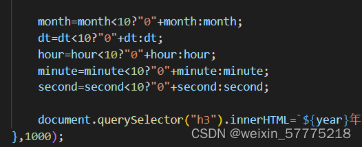 5.显示当前时间;获取到我们上面设置的div标签里的h3标签设置innerHTML给它显示上刚才设置的变量进行时间的显示,然后script里面在获取时间外面设置上定时器(设置间隔性定时器给它设置每1000毫秒进行一次)如下图: