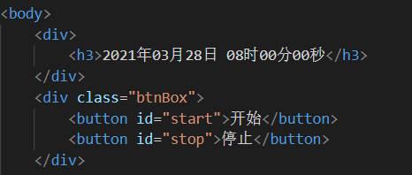 1.首先创建好 html 的格式(!+Tab),然后在 body 设置一个div标签,在div标签里面设置p标签并写上要显示的时间;然后再创建一个div标签在里面创建两个button标签写(开始和停止),如下图: