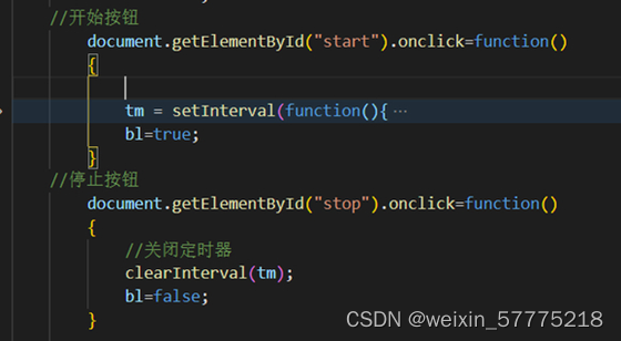 8.注:如果鼠标连续多次点击开始按钮会出现不能停止的情况,解决暴力点击的方法:先声明一个初始值为false(var bl=false;)的全局变量,给开始按钮的定时器里边设置bl变量给它赋值为true,再在停止按钮的定时器里边设置bl变量并给它赋值为false,在开始按钮定时器里设置判断,设置如果bl变量为true时就用return直接返回停止执行,如下图: