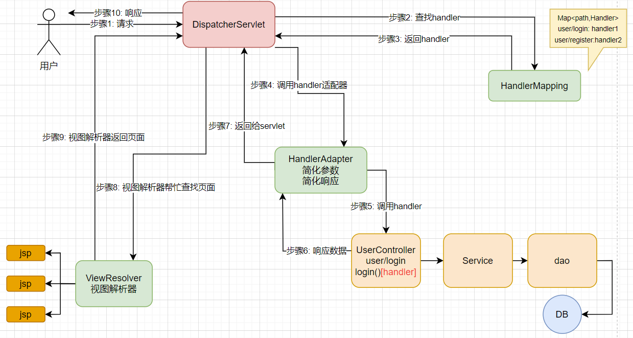 SpringMVC学习笔记 Spring Web MVC 是基于 Servlet API 构建的原始 Web 框架。原始 Servlet API 开发代码片段// 实现Servlet接口@Override//取得参数//业务逻辑//视图跳转@Override在 web.xml 中注册 Servlet。
