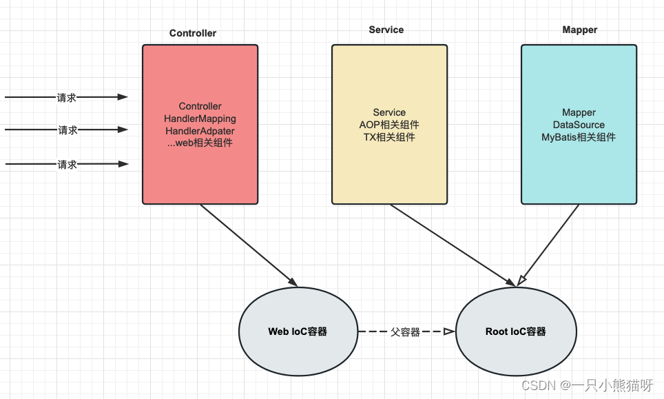 SSM 整合笔记 微观:将学习的 Spring SpringMVC Mybatis 框架应用到项目中!SpringMVC 框架负责控制层Spring 框架负责整体和业务层的声明式事务管理MyBatis 框架负责数据库访问层宏观:Spring 接管一切(将框架核心组件交给 Spring 进行 IoC 管理),代码更加简洁。SpringMVC 管理表述层、SpringMVC 相关组件Spring管理业务层、持久层、以及数据库相关(DataSource,MyBatis)的组件使用IoC的方式管理一切所需组件。