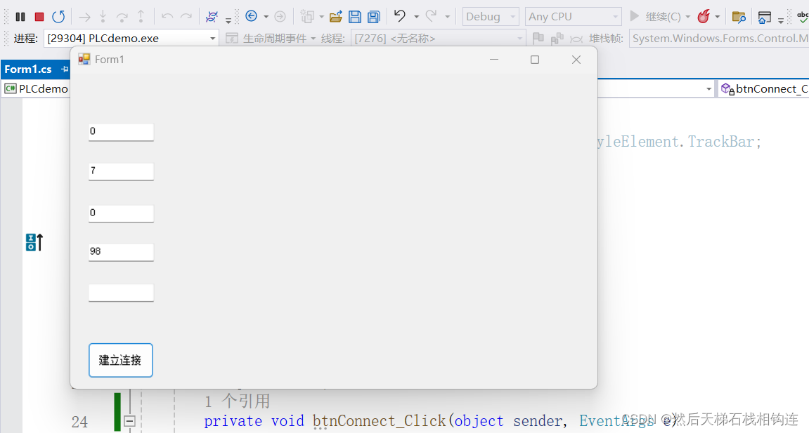 接着尝试连接plc(可以放在一个点击事件里)