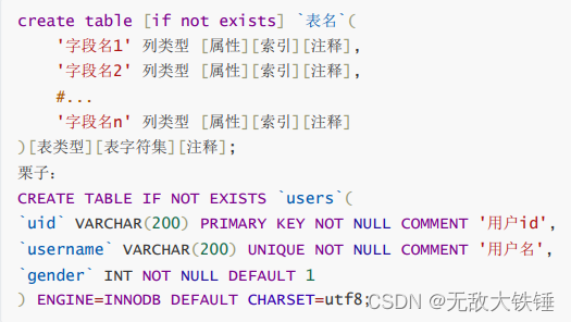 用于设置唯一性,不能重复,但是可以为空 ENGINE=innodb DEFAULT CHARSET=utf8 :SQL引擎及其约束和字符编码;