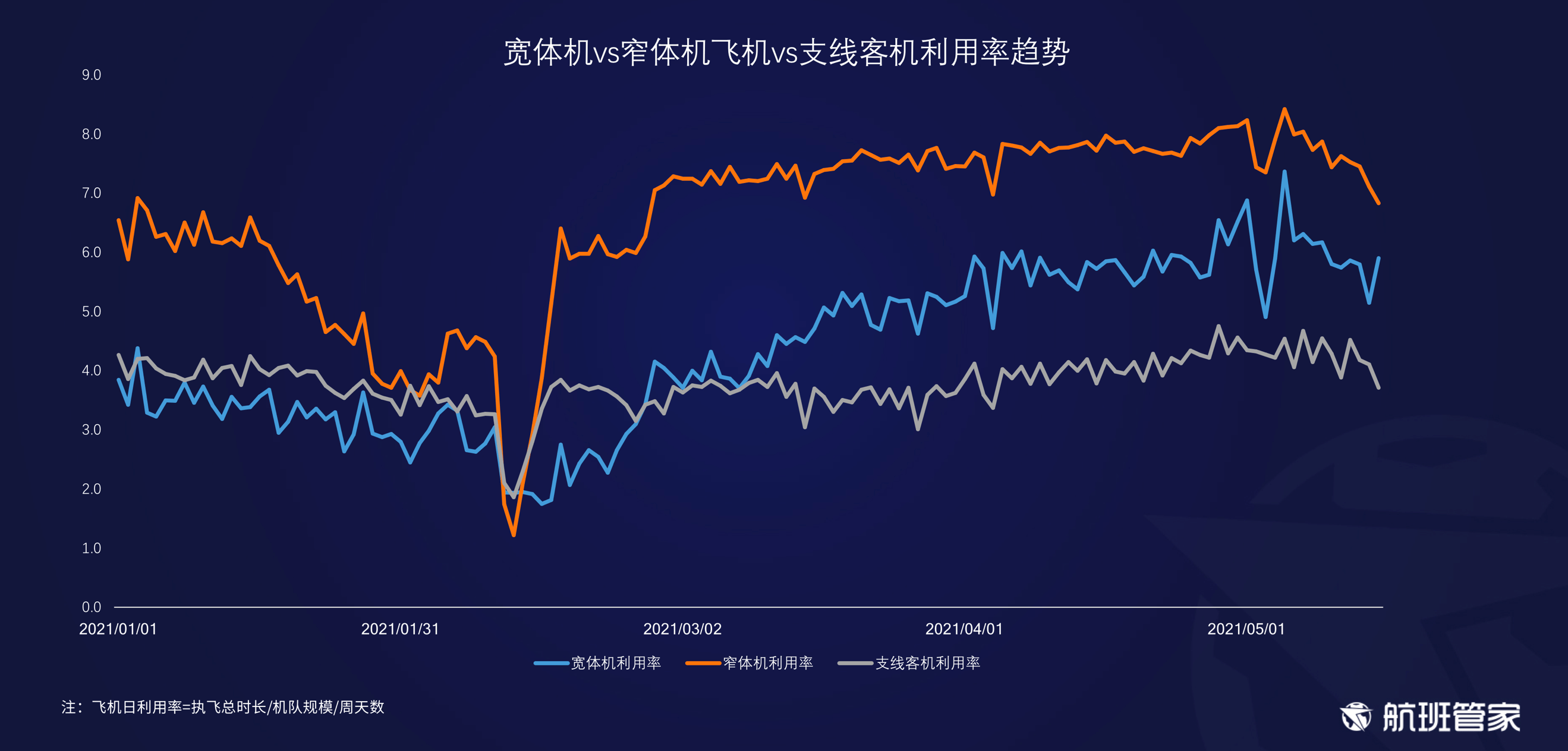 宽体机飞机利用率5.6小时/天,窄体机飞机利用率为7.3小时/天,支线客机飞机利用率为4.1小时/天。