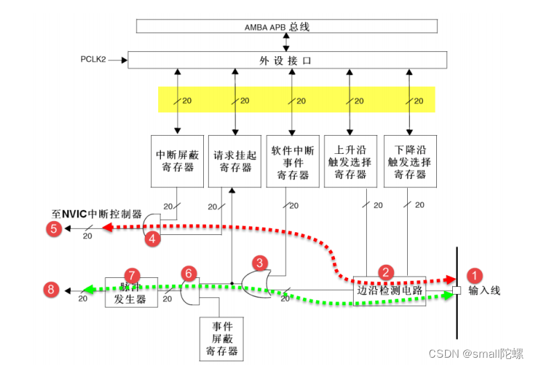 红色虚线指示的电路流程。它是一个产生中断的线路,最终信号流入到 NVIC 控制器内。