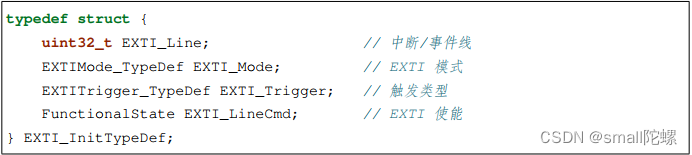4) EXTI_LineCmd:控制是否使能 EXTI 线,可选使能 EXTI 线 (ENABLE) 或禁用 (DISABLE)。