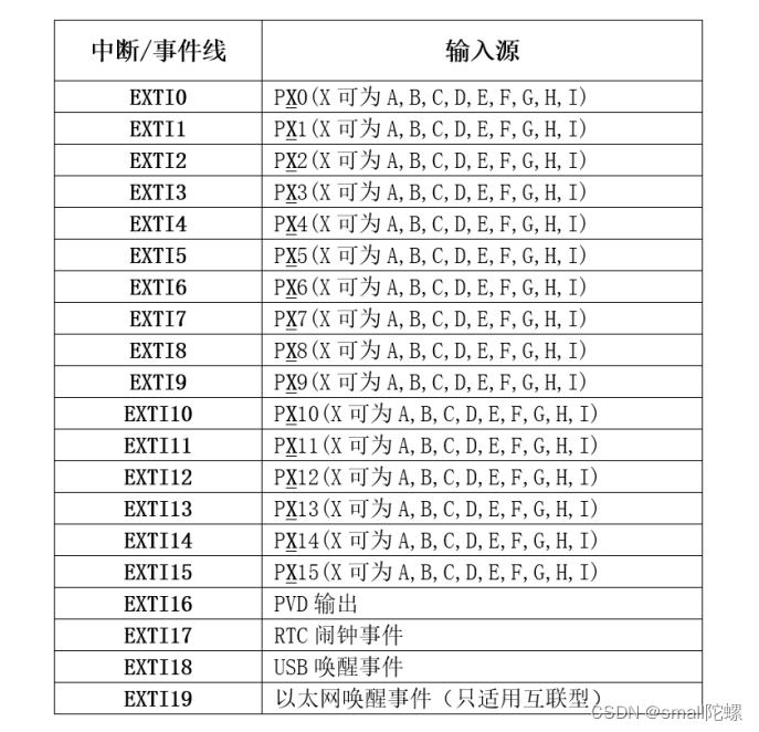 EXTI0 至 EXTI15 用于 GPIO,通过编程控制可以实现任意一个 GPIO 作为 EXTI 的输入源。