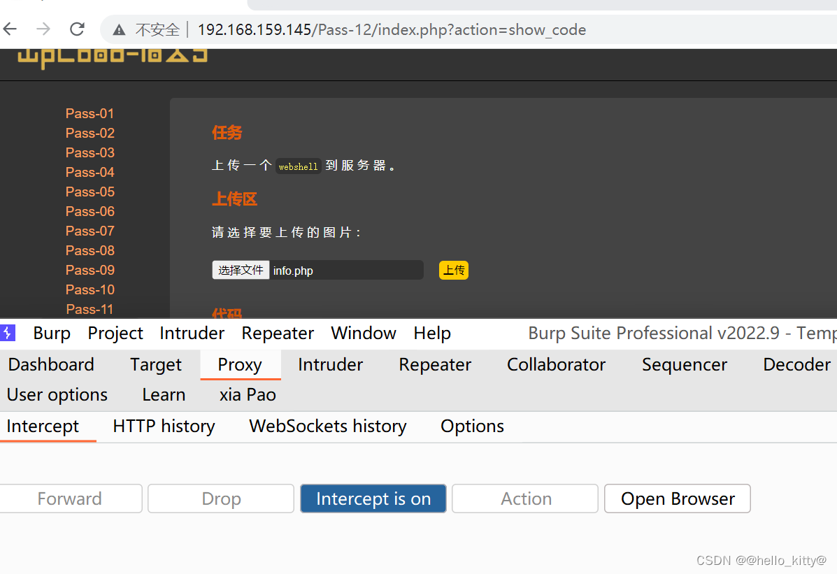 与上一关(十一关题解)思路相同,我们通过修改save_path的值进行00截断操作,从而达到木马php文件成功上传的目的,首先打开burpsuite进行监听,然后上传木马php文件: